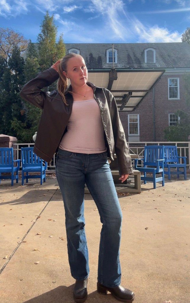 Throughout the week, even I begin to yearn for a break from the starchiness of jeans and for just plain comfort. On these occasions, I typically gravitate towards leggings or sweatpants. Yet, I still have the urge to look put together, which I never seem to be able to accomplish in my many baggy hoodies. For this mood and low 60s weather, the oversized cardigan is perfection. With a draping silhouette that makes it easy to wrap fully around myself, as well as the soft fabric of the knitting, I always come back to my oversized cardigan. In this I feel cozy yet also still stylish, knowing I can easily shed the leather if I begin to overheat. I style my oversized pumpkin colored cardigan with black flared leggings, UGGs and a gray longsleeve.