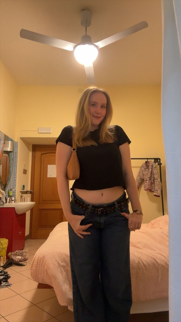 It was the warmest day of my trip, so of course I dressed in a way that resulted in a farmers tan. I wore a black cropped t shirt and blue jeans with a matching black belt. On that day I was visiting the colosseum, and wanted to look my best to beg strangers to take pictures of me. One of the downsides of solo travel is the fact you can only take selfies of yourself, unless you want to entrust your expensive camera to a stranger. But for the sunny day at the colosseum, I found the ability to trust. I made sure to ask strangers when I was inside and outside the colosseum, pushing back my usual fear of being bothersome.